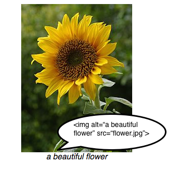 <img src='flower.jpg' alt='a beautiful flower'></img>