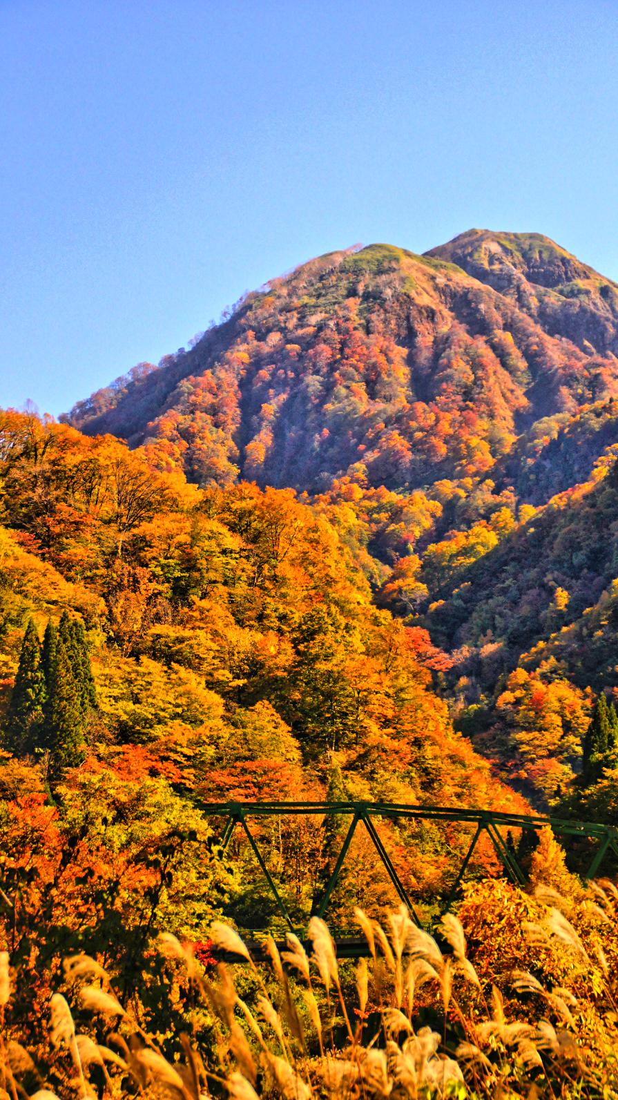 県道は峡谷は切り立っており、刈込池が色づいている頃にももう、ちらちらと木々の赤が目に入ります。岩肌とのコントラストを楽しみましょう。渓谷の先に見えるのが別山です。その標高から高木はなく、その滑らかな山肌はとても存在感があります。