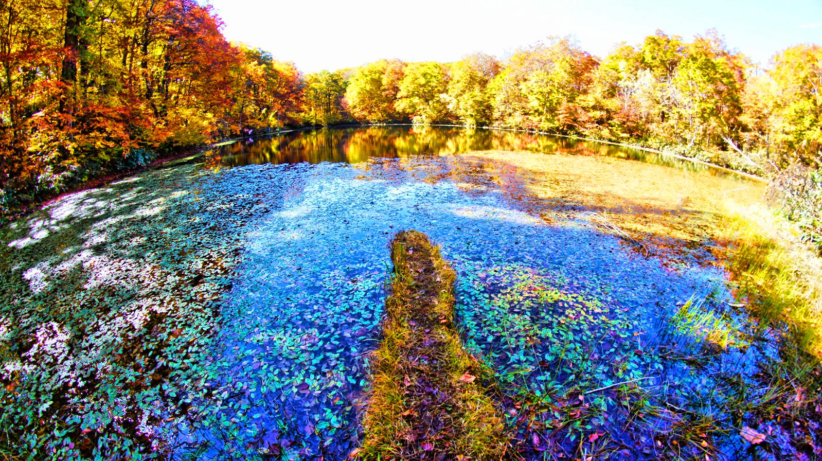 左手に注目しながら歩くと、木々の間に青が見えます。池に反射した空の色です。喧噪は増し、たくさんの人が休憩している池のほとりにたどり着きます。2カ所程撮影ポイントがあります。どちらもぬかるんでいるので足下には気をつけましょう。ベンチもいくつかあるので休憩もできます。