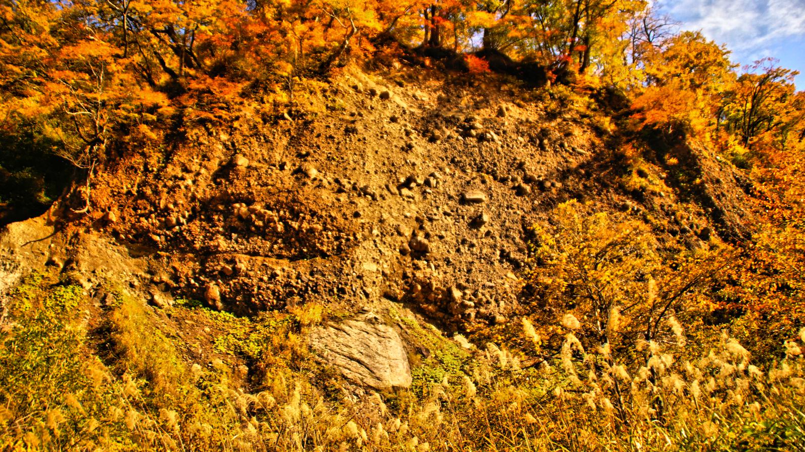 刈込池の台地は幅ヶ平と呼ばれ、火山活動による崩落により形成されました。その崩れた岩肌はこの台地がその堆積物である事を感じさせます。上にブナが半分根をだしています。今にも崩れそうでぞっとします。