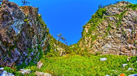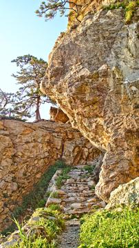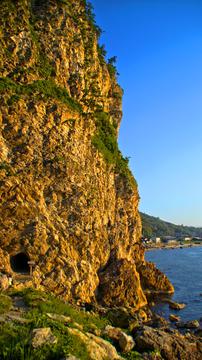 せっぷんトンネルから続く岩場の波の花遊歩道は起伏を繰り返し、八世の洞窟の辺りで道が細くなってきます。この先には冬場流れ落ちる水が日本海の強風で消えてしまう垂水の滝がありますが、道は悪く危険なので反対側の真浦ポケットパークからのアクセスをおすすめします。