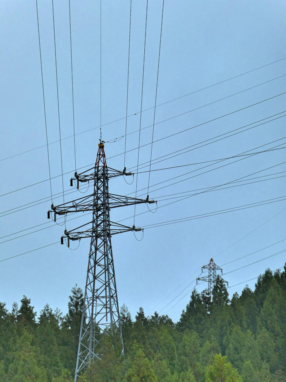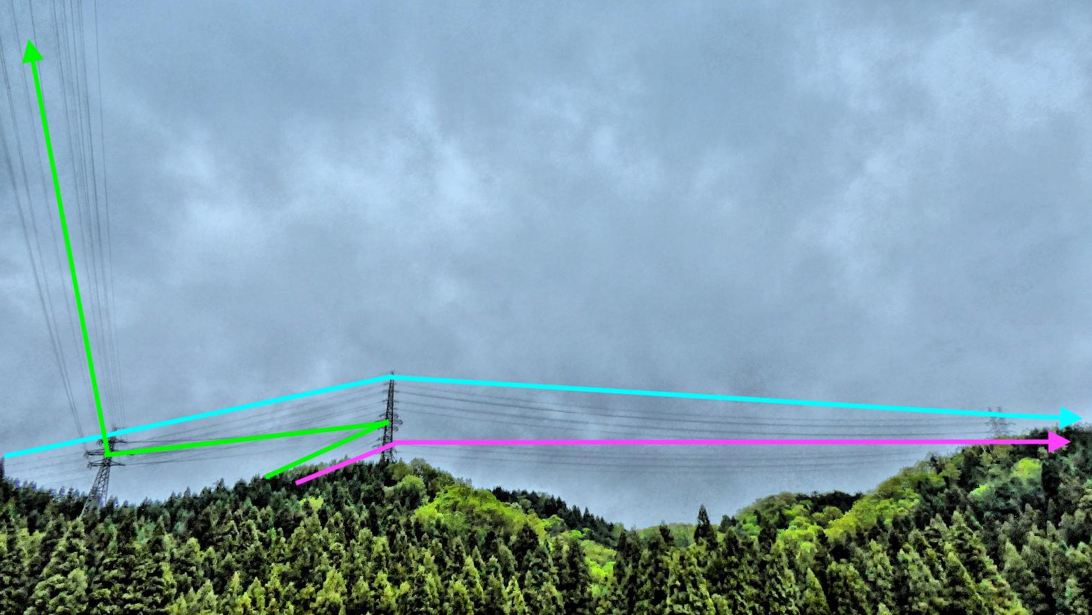 つまり紫色が巡視路の立て札で見た吉川線で、水色が西側に出て2番めの例の2段角度鉄塔から分配されてきた新武生丹生線。それが次の鉄塔で併架されて山を降りているというわけです。だからその先の鉄塔はこの2つの併架だったわけですね。