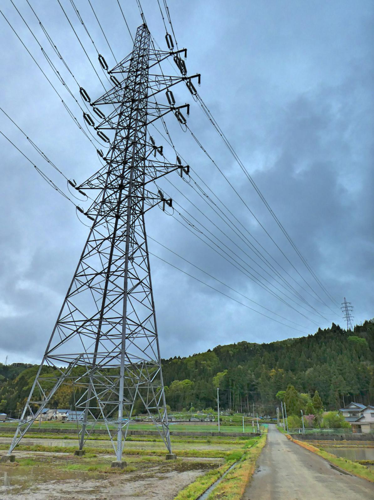 福井市の西側、福井健康の森の方向から県道32号線に乗ると、まず見えるのが南の山の上の4回線角度鉄塔。